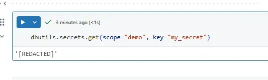 If you attempt to print the secret directly, Databricks will mask it by displaying REDACTED instead of the actual value. This behavior helps prevent accidental exposure of credentials.