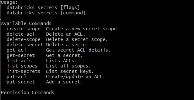 You’ll get a list of available subcommands, such as creating scopes, adding secrets, or setting access permissions.