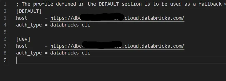 To configure it, simply copy the host and auth_type values from your dev profile and paste them under the DEFAULT section within the .databrickscfg file.