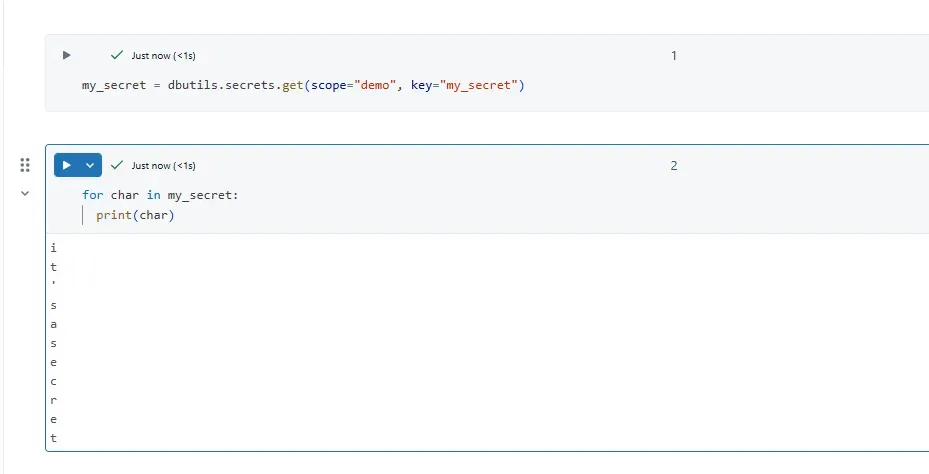 By printing the secret character-by-character, Databricks won’t apply redaction, and you’ll see the full secret vertically in the output.