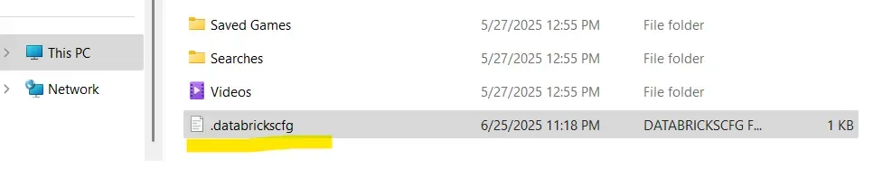 Inside the .databrickscfg file, you’ll find the profile that was just created during authentication. This section includes your workspace URL, token or authentication type, and other relevant configuration data. You can manage several environments (for example, dev, staging, and prod) by defining multiple profiles in this same file and switching between them via the --profile flag when executing CLI commands.