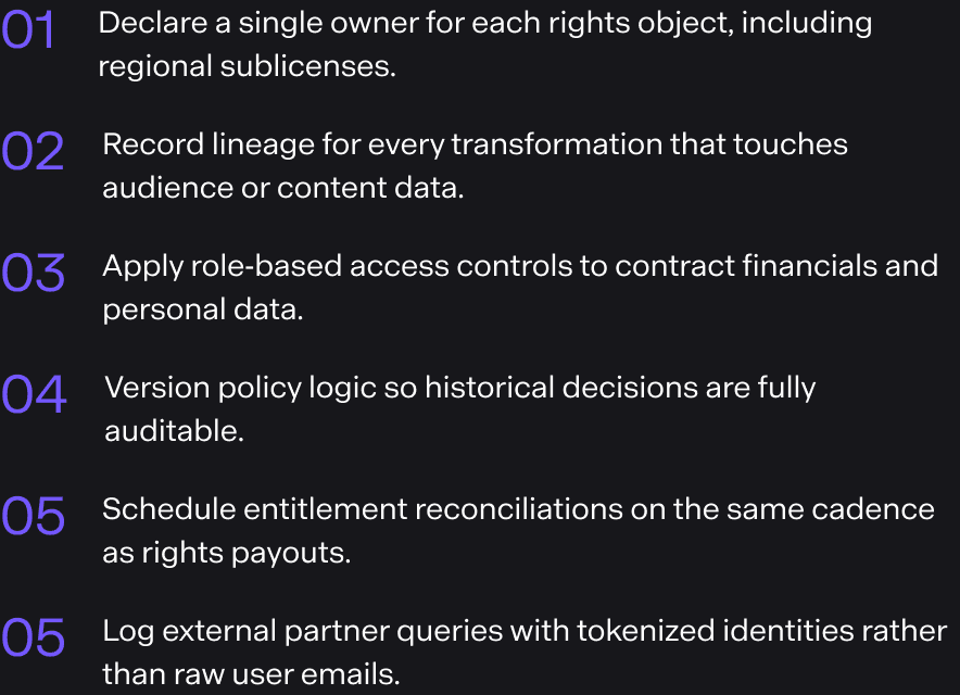 Leaders see speed when highlight clips are published faster and disputes are resolved sooner. Compliance teams relax because contract logic moves upstream. Developers gain confidence as each win hardens the shared data model. That confidence fuels the foundational work next.
