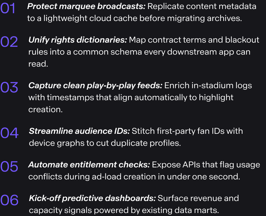 Priorities only stick when tied to cash. Sports media monetization now stretches across linear feeds, streaming bundles, social clips, and on‑site activations. Each line of business depends on rapid, accurate data to price inventory and prove value to partners. Mapping modernization tasks directly to revenue triggers aligns IT and commercial calendars.