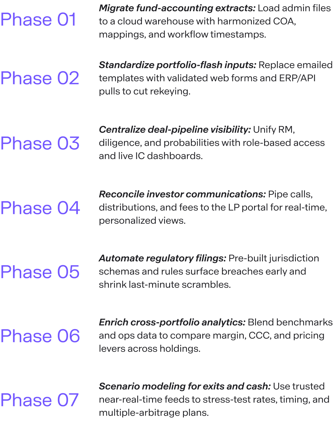 Start where value leaks are largest. Phase 1 ingests administrator extracts into a governed warehouse with harmonized charts. Phase 2 standardizes portfolio flash via validated forms and APIs to stop rekeying at the source. Phase 3 centralizes deal pipeline so finance and compliance see changes instantly. Phase 4 connects the warehouse to the LP portal for accurate, on-demand statements. Phases 5–7 automate filings, layer cross-portfolio analytics, and introduce scenario modeling. Each phase defines a KPI—days to close, hours saved, LP turnaround—and proves it before moving on.